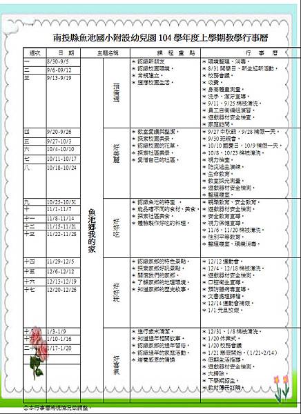 魚池國小附設幼兒園104學年度第一學期行事曆
