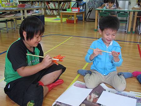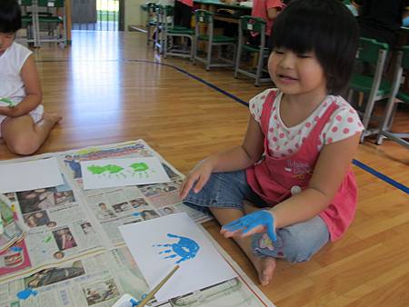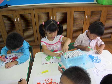 以往都是透過用具讓孩子做畫,改以玩樂的方式和孩子一起體驗 手指與手掌作畫的感覺,絕對與只利用彩色筆來作畫的感覺還要好。 每個孩子都很高興的將顏料塗在手上,許多孩子都笑說:「好癢喔」 、「冰冰的」,大家都能將手掌印畫出他心目中的可愛作品喔。 我們的作品已經張貼在走廊上提供大家欣賞,歡迎來多多捧場。